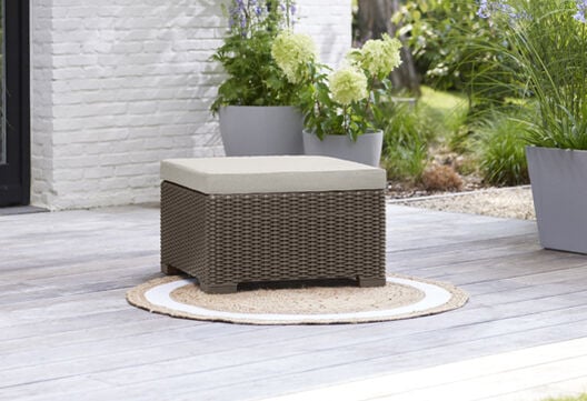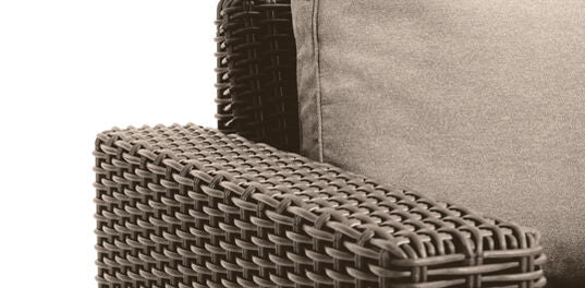 The California set is made of more than 83% recycled plastic with a 6mm round wicker design. The woven wicker style creates a luxurious and trendy look and can create a focal point in any outdoor space. The set consists of a three seater sofa with wide deep seating , a table and square foot stool with cushion which is perfect for putting your feet up and relaxing or as an extra seating option when hosting indoor' s in your conservatory, or outdoors on gardens and patio areas. The cushions included are 7.5 cm thick and provide optimal seating comfort to relax and unwind. Lightweight in its structure therefore is easier to move to suit any setting and is easy and quick to assemble. The garden set is completely maintenance-free and weather-resistant, so you can enjoy the lounge set for years to come.