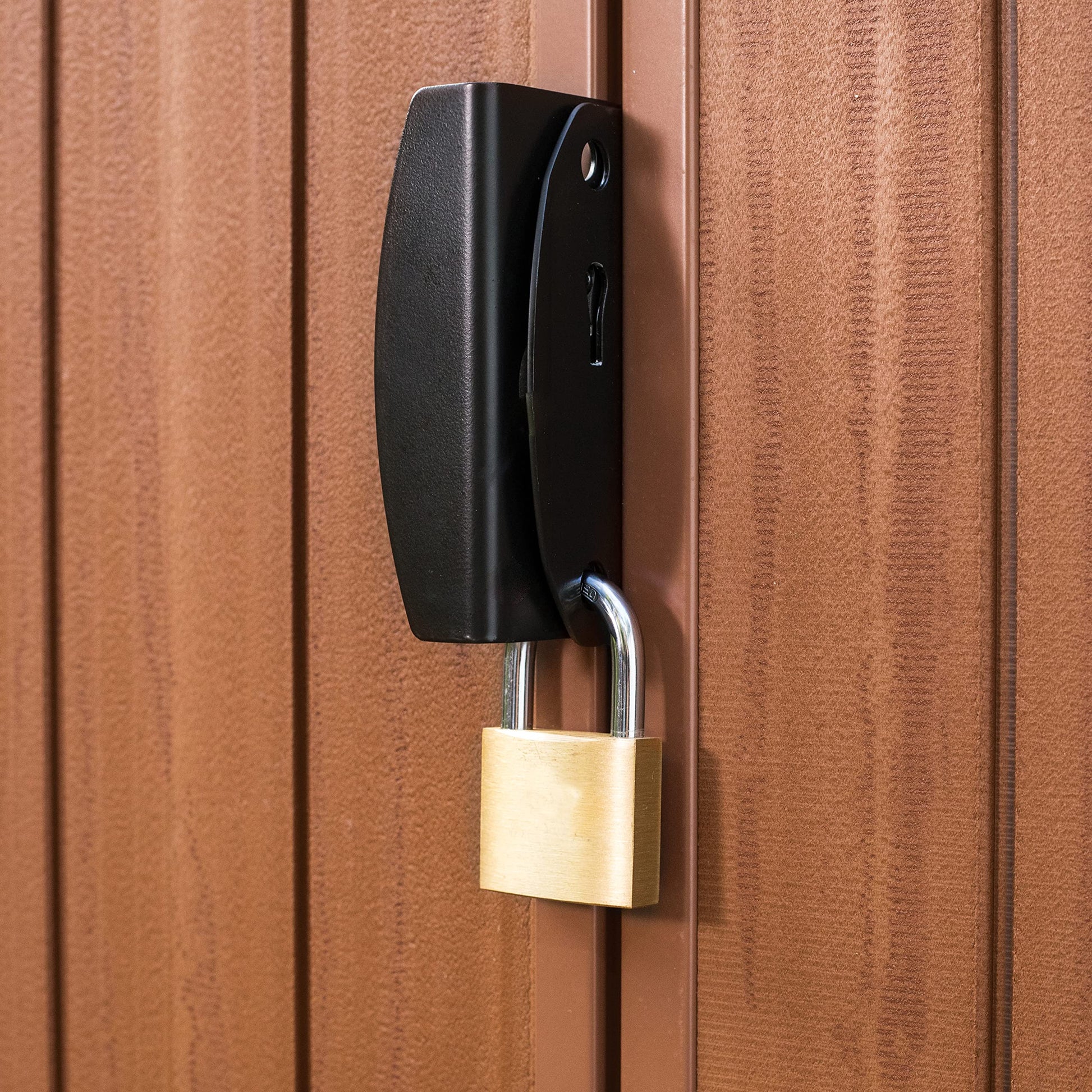 - Heavy duty floor panel with tongue and groove panels for easy assembly and lock hasp for additional security