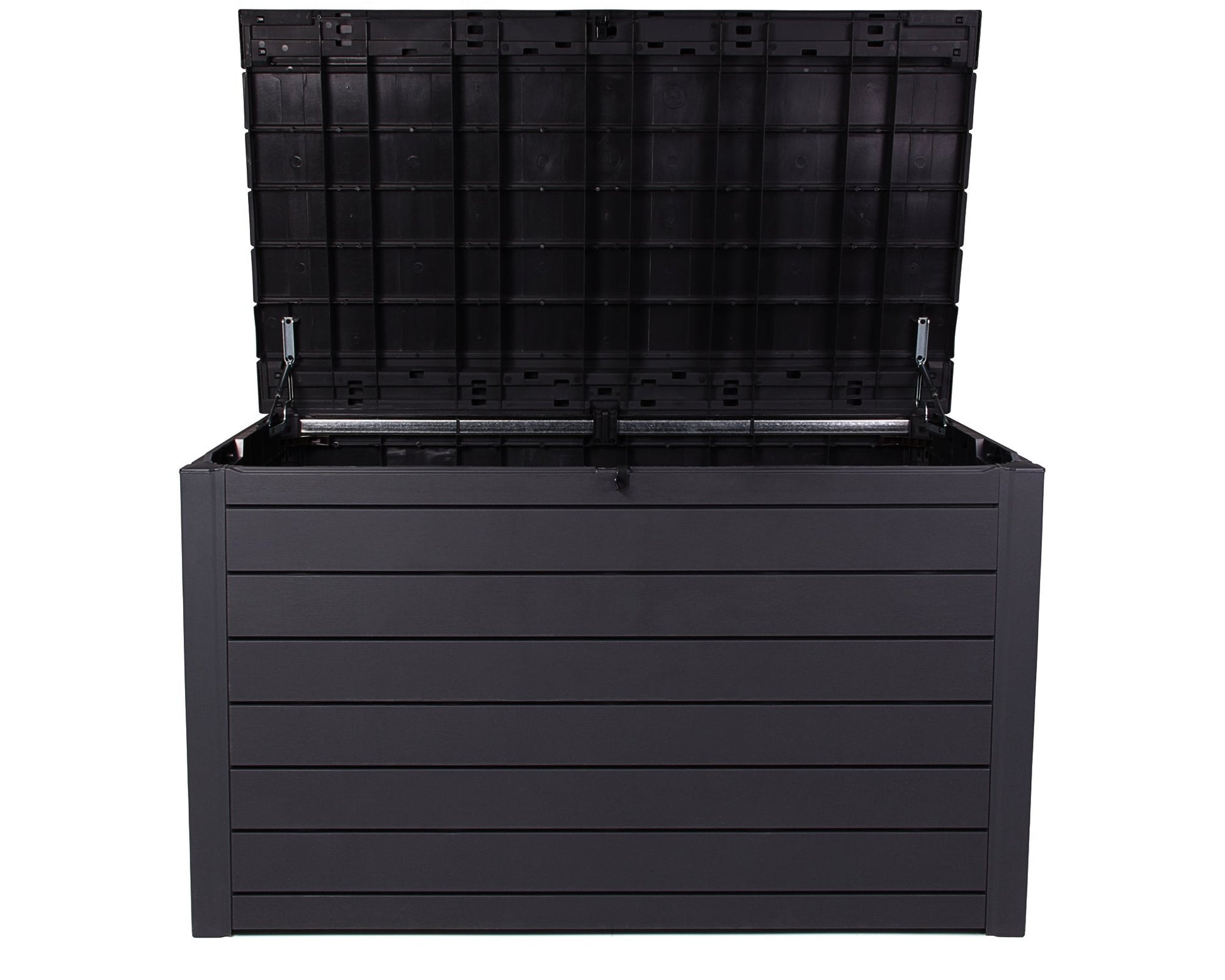- It is of high quality and sturdy. For stability, the box was reinforced with metal, practical gas pressure springs, which raise the lid almost by itself. The high quality plastic is UV-resistant and weatherproof and therefore suitable for year-round outdoor use. It can even stay out in winter. It is virtually maintenance-free and there is no painting or sanding needed.