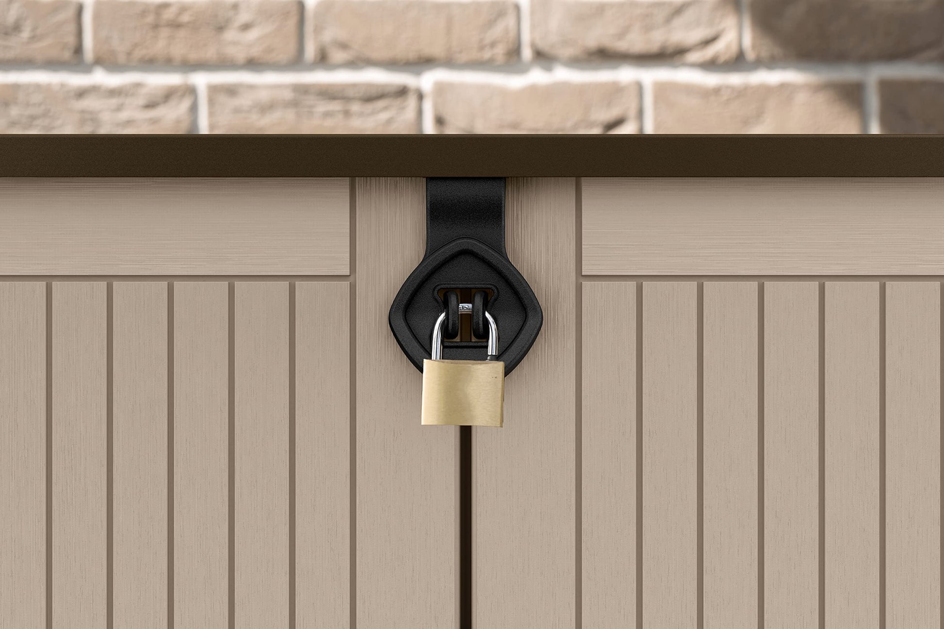 - Hinged lid (with gas lifts) and 2 front doors, lockable (lock not included)
