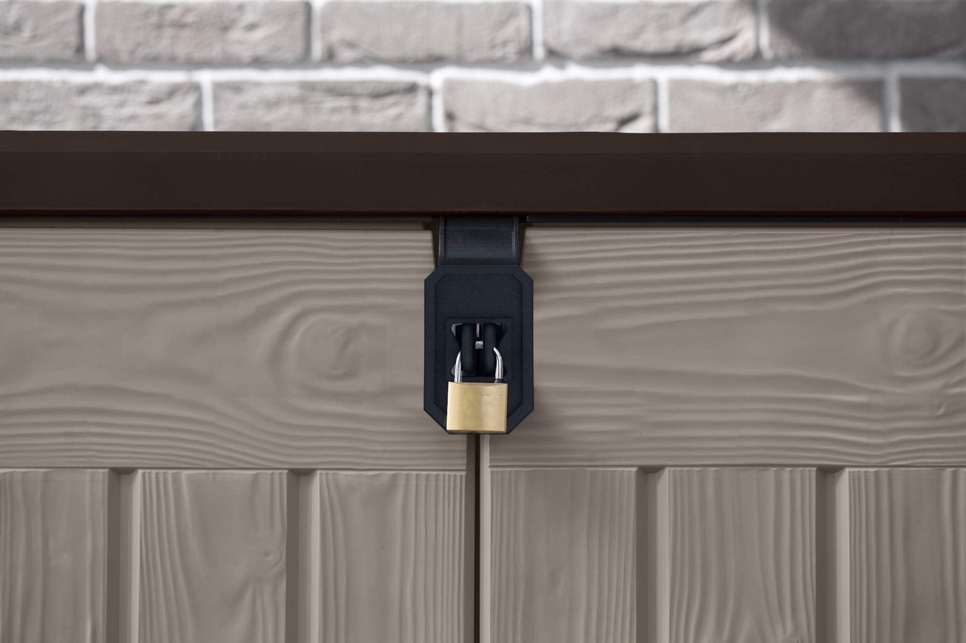 Keter Store It Out Pro Outdoor Garden Furniture Storage Shed Beige with Brown Lid Fade Free All Weather Resistant Safe and Secure Zero Maintenance 5 year Warranty