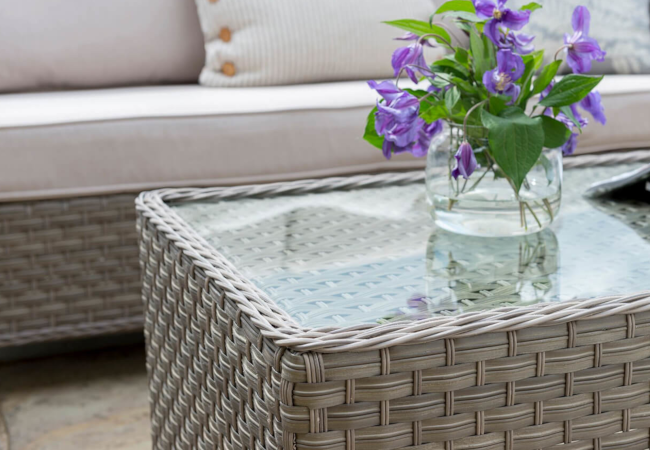 It is made from hard-wearing synthetic wicker which has been woven onto a sturdy aluminium frame. This makes the set weather resistant, meaning it can be left out all year round without worry of damage or wearing caused by poor weather conditions.