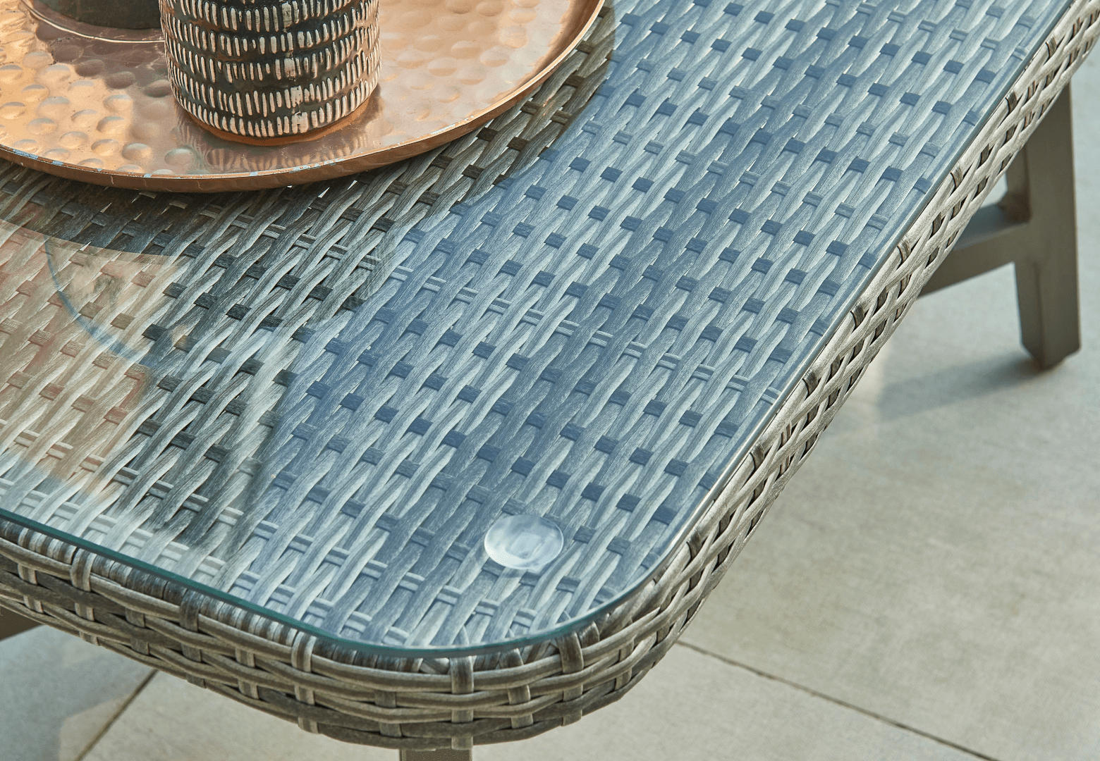 It is made from synthetic 6mm flat weave, which along with its aluminium frame, means that it can left outside all year round (excl. cushions). However, the cushions are resistant to stains and brief showers, as well as being extremely comfortable.