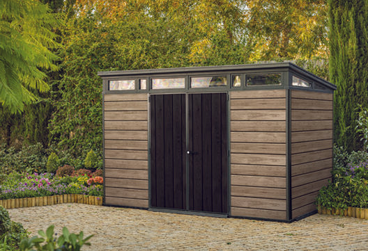 Large outdoor storage doesn’t get any more premium than the Pent 11x7 storage shed, part of Keter’s Signature Collection. Its walls are constructed with our innovative, cutting edge material that won’t chip, peel, flake, rot, or sustain any water damage. It’s completely weatherproof and maintenance-free with a roof that is steel-reinforced and can withstand 150 kg/sqm of snow. Inside this attractive storage unit is 13.7 cubic meters of space that’s large enough for whatever you have: bicycles, garden equipment, and even a full-sized riding lawn mower. Don’t worry, its tough, heavy-duty floor can support all of it. You can also add the optional Keter Shelf Kit to keep everything neatly organised. Crystal clear windows allow for extra light and add to the overall sleek, modern design. And everything is secured behind double lockable doors. If you want to go big with your outdoor storage that retains the look of nature, you can’t go wrong with the Pent 11x7 shed.