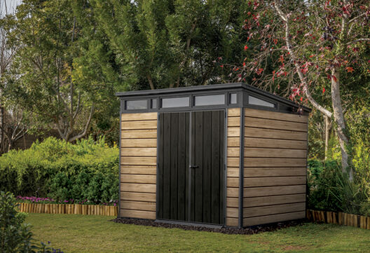 Transform any outdoor space beyond the ordinary with the Pent 9x7 shed from Keter’s Signature Collection. This premium, elegant-looking storage unit that has the light tones of wood, is composed of innovative, cutting-edge composite material. It won’t chip, peel, flake, rot, or sustain water damage. It is completely weather-resistant, maintenance free and its steel-reinforced roof can withstand up to 150kg of snow. Inside, 11.05 cubic meters of space gives enough room to store a lawnmower among other outdoor items which can all be organised neatly with the optional Keter Shelf Kit. Crystal clear windows also allow for plenty of light and add to the overall sleek, modern design. And everything will be safe and secure behind its double lockable doors. Whoever says outdoor storage can’t be stylish has never experienced the Keter Signature Pent 9x7 shed.