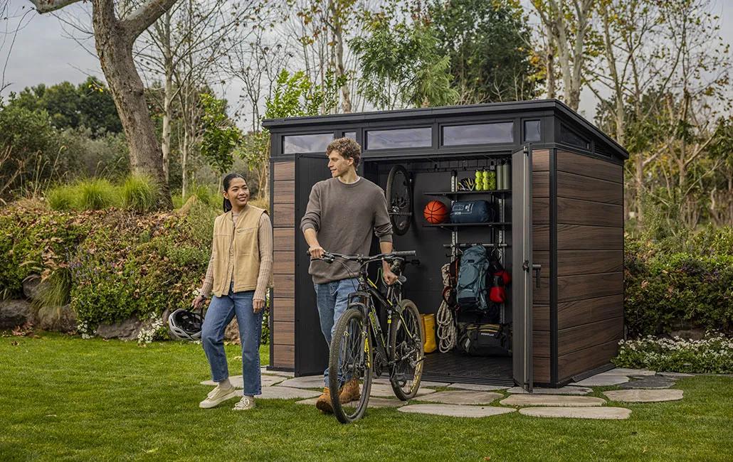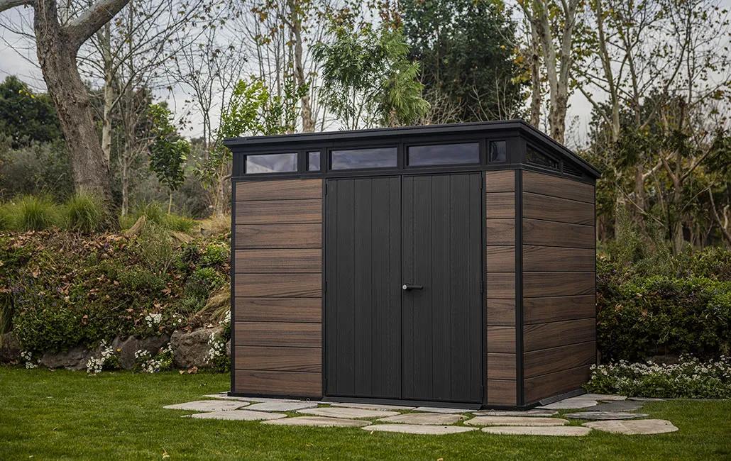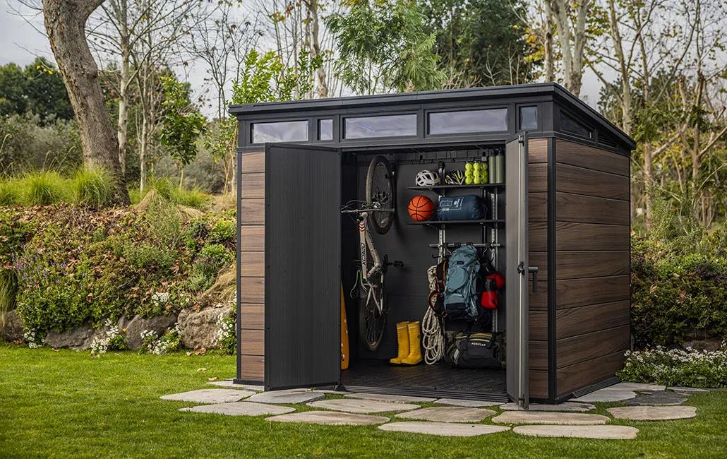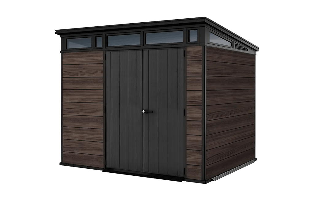 Transform your outdoor space with the Keter Signature Collection Pent 9x7 shed. This premium storage unit combines an elegant look with the light tones of wood and is made from innovative composite materials. It won't chip, peel, flake, rot, or suffer from water damage. Completely weather-resistant and maintenance-free, its steel-reinforced roof can support up to 150 kg of snow.Inside, you'll find 11.05 cubic meters of space, providing ample room to store a lawnmower and other outdoor items. You can keep everything organised with the optional Keter Shelf Kit. The crystal-clear windows allow plenty of natural light and enhance the modern design. Plus, everything will be safe and secure behind the double lockable doors. Anyone who thinks outdoor storage can't be stylish hasn't experienced the Keter Signature Pent 9x7 shed.